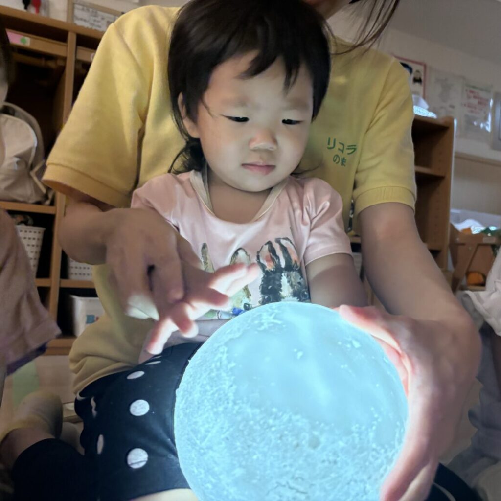 球を叩くと色が変わり、不思議に光る地球儀に園児は興味津々。