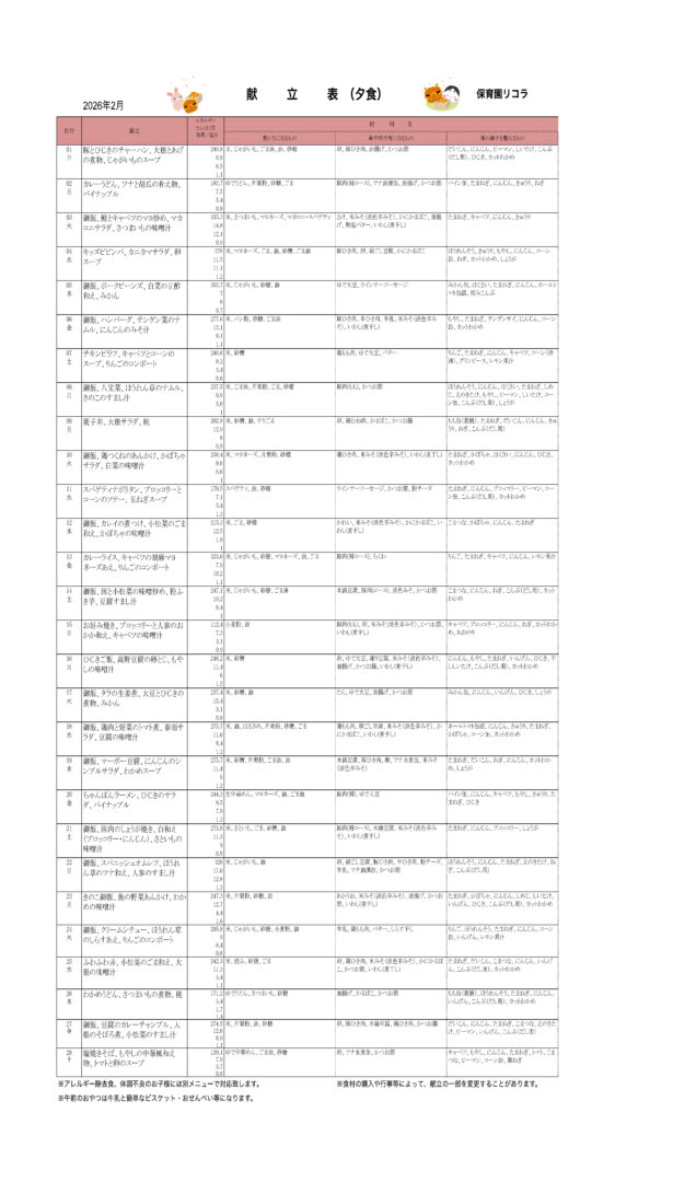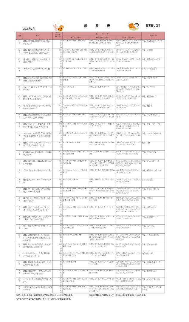 2月の献立表|大阪の企業主導型保育園リコラ