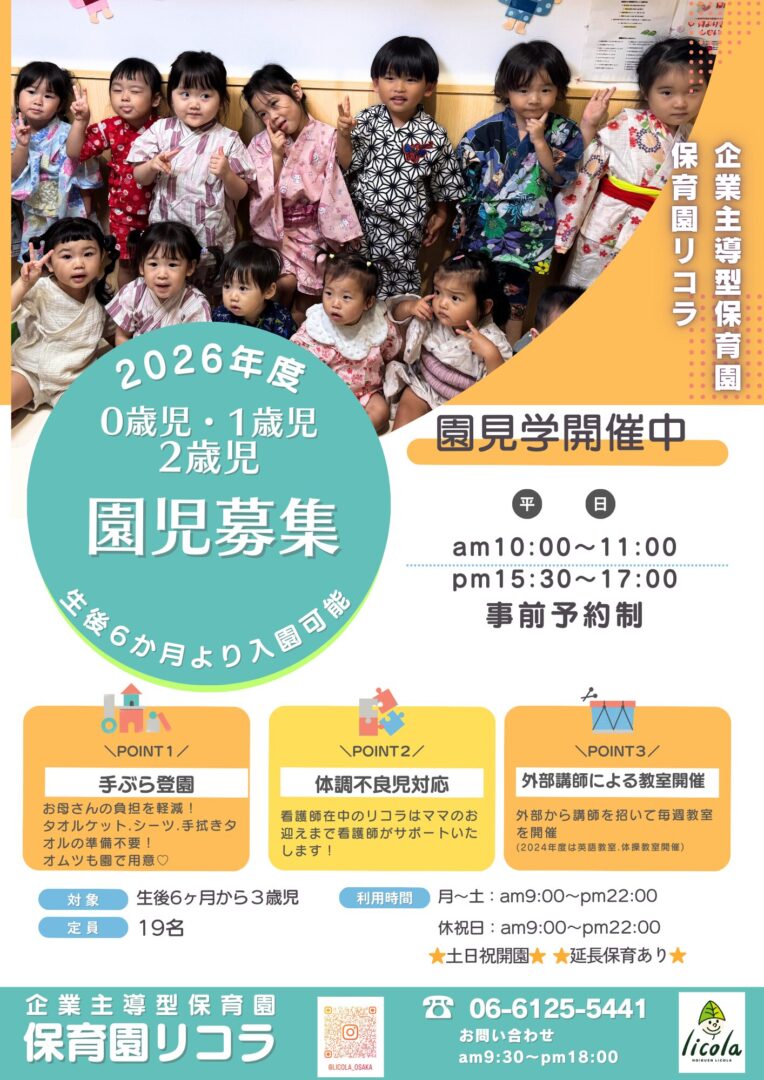 ニュース 12月の空き状況のお知らせ|大阪の企業主導型保育園リコラ 2025年12月2日 ■12月の空き状況 0歳児クラス:0名 1歳児クラス:0名 2歳児クラス:1名 3歳児クラス:0名 ■キャッシュレス決済対応しました! 保育園リコラではAir Pay導入しました! バーコード決済にてお支払いが可能です。 ■保育士比率は100%です! 当園は保育士比率100%ですので、安心してご利用いただけます。(保育... licola-osaka