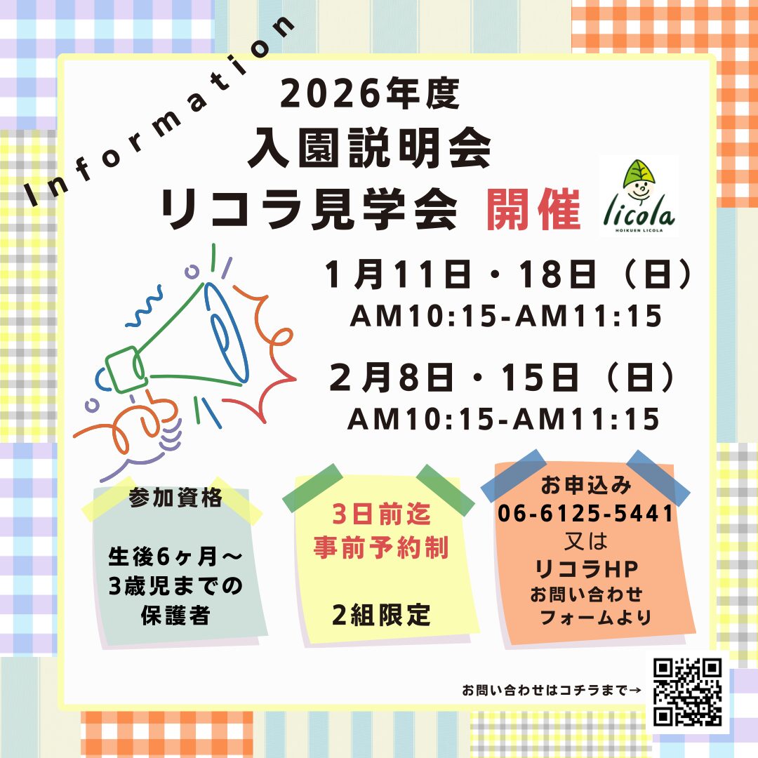 ニュース 1月の空き状況のお知らせ|大阪の企業主導型保育園リコラ 2026年1月4日 ■1月の空き状況 0歳児クラス:0名 1歳児クラス:0名 2歳児クラス:1名 3歳児クラス:0名 ■キャッシュレス決済対応しました! 保育園リコラではAir Pay導入しました! バーコード決済にてお支払いが可能です。 ■保育士比率は100%です! 当園は保育士比率100%ですので、安心してご利用いただけます。(保育補... licola-osaka